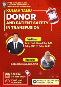 Pada tanggal 28 Mei 2024, Program Studi Patologi Klinik Fakultas Kedokteran Universitas Diponegoro menyelenggarakan Kuliah Tamu dengan tema “Donor and Patient Safety in Transfusion”. Acara