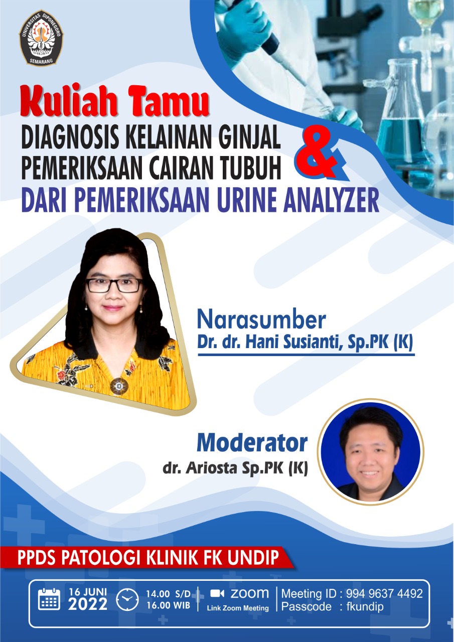 In order to improve the competence of students of the Clinical Pathology Specialist Medical Education Program, Faculty of Medicine, Diponegoro University in the field of infectious diseases, it is necessary to have lecture activities by inviting competent teaching staff from outside. In this regard, on June 16, 2022, the Clinical Pathology Study Program, Medical Faculty of Diponegoro University, held a Guest Lecture with the topic “Diagnostic of Kidney Disorders and Examination of Body Fluids from Urine Analyzer Examination” by inviting Dr. dr. Hani Susianti, Sp.PK(K) from FK Universitas Brawijaya Malang as resource person.