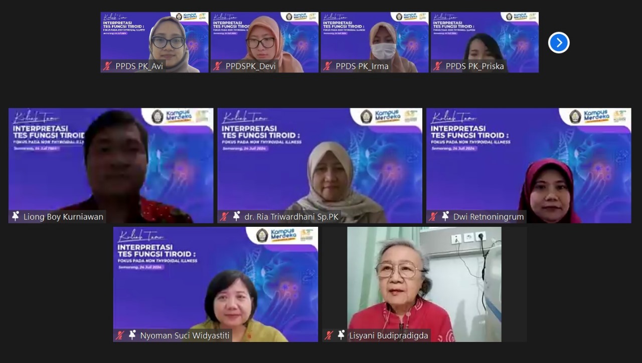 Pada tanggal 24 Juli 2024, Program Studi Patologi Klinik mengadakan kegiatan kuliah tamu berjudul “ Interpretasi Tes Fungsi Tiroid : Fokus pada Non Thyroidal Illness. Kegiatan ini diselenggarakan secara daring melalui platform Zoom Meeting guna memfasilitasi partisipasi dari seluruh peserta yang tergabung dalam Dokter Spesialis Patologi Klinik yang tergabung dalam PDS PatKLIn Cabang Semarang dan Program Pendidikan Dokter Spesialis Patologi Klinik Fakultas Kedokteran Universitas Diponegoro serta Program Pendidikan Dokter Spesialis Patologi Klinik Fakultas Kedokteran Universitas Hasanudin .