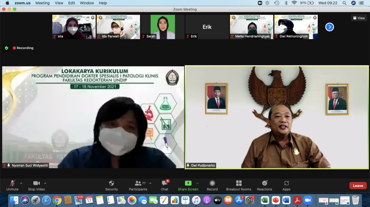 Menyusul hari berikutnya, Prodi Patologi Klinis juga menyelenggarakan Lokakarya Kurikulum PPDS I pada tanggal 17-18 November 2021 dengan mengundang narasumber Dr. Ir. Setia Budi Sasongko, DEA dari LP2MP dan tim Kurikulum Sp1 dari Kolegium : Prof. Dr. Ida Parwati, dr., Sp.PK(K), Ph.D; Dr. Osman Sianipar, dr., DMM, MSc, SpPK(K); Dr. Umi Solekhah Intansari, dr., MKes, SpPK(K). Lokakarya Kurikulum ini diselenggarakan dengan mengacu Peraturan Konsil Kedokteran Indonesia Nomor 98 Tahun 2021 Tentang Standar Pendidikan Profesi Dokter Spesialis Patologi Klinik.